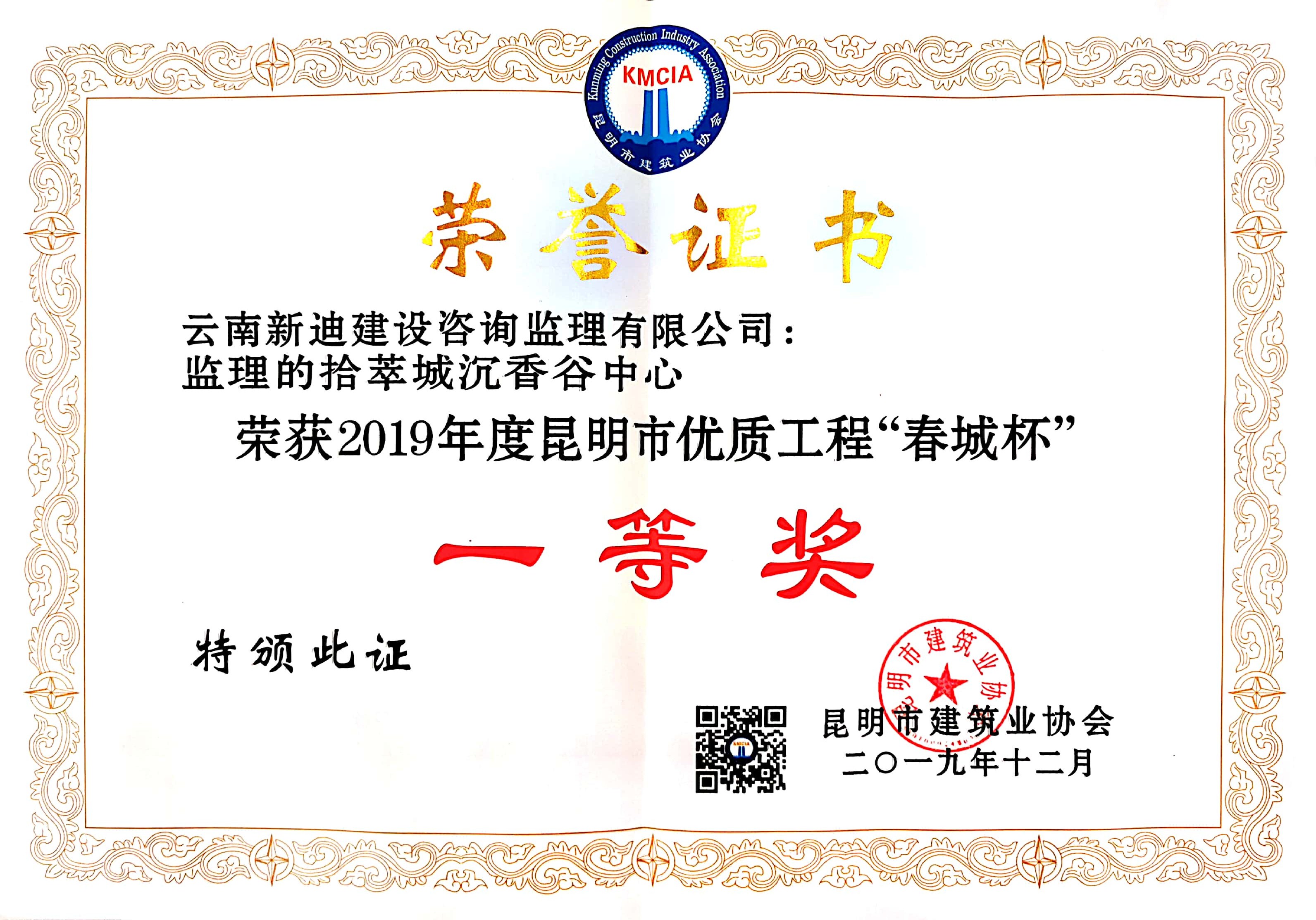 2019年度昆明市優(yōu)質(zhì)工程“春城杯”一等獎(拾萃城沉香谷中心)